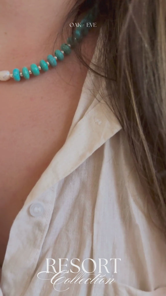 Handcrafted with polished sterling silver beads, this piece features a luminous freshwater pearl at the centre, framed by dyed turquoise hematite beads for a subtle pop of ocean-inspired colour. The contrast between cool silver, vibrant turquoise, and the organic beauty of the pearl creates a look that feels both modern and timeless.