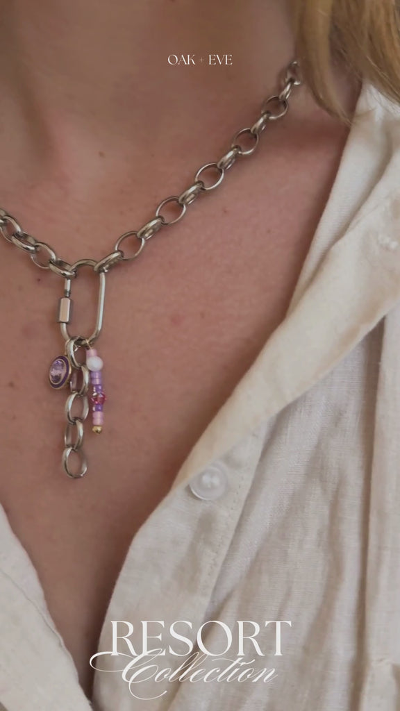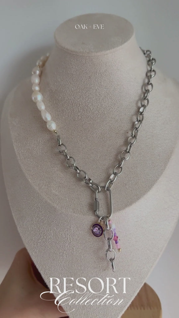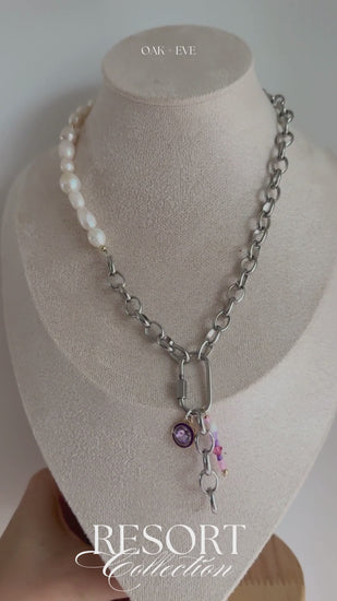 Crafted with a stainless steel chain and carabiner clasp, this piece features a curated mix of purple-inspired charms paired with organic freshwater pearls. Soft lilac tones, subtle sparkle, and natural textures come together to create a necklace that feels romantic yet modern—perfect for sun-soaked days and golden-hour evenings.