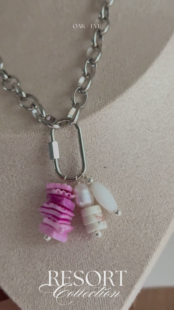 Finished with a bold carabiner clasp, this piece features three thoughtfully curated charms: a gemstone, an freshwater pearl, and dyed purple seashells that add a soft pop of colour and coastal texture. The mix of polished metal and natural elements creates a look that feels modern, relaxed, and perfectly suited for warm-weather styling.