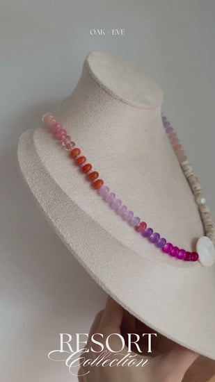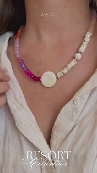 Delicate, dreamy, and made for sun-soaked days. This Necklace features an assortment of hand-selected pink-toned beads, each one slightly unique in hue, creating a beautifully organic look. At the centre sits a luminous shell bead, adding a subtle coastal touch that catches the light effortlessly.
